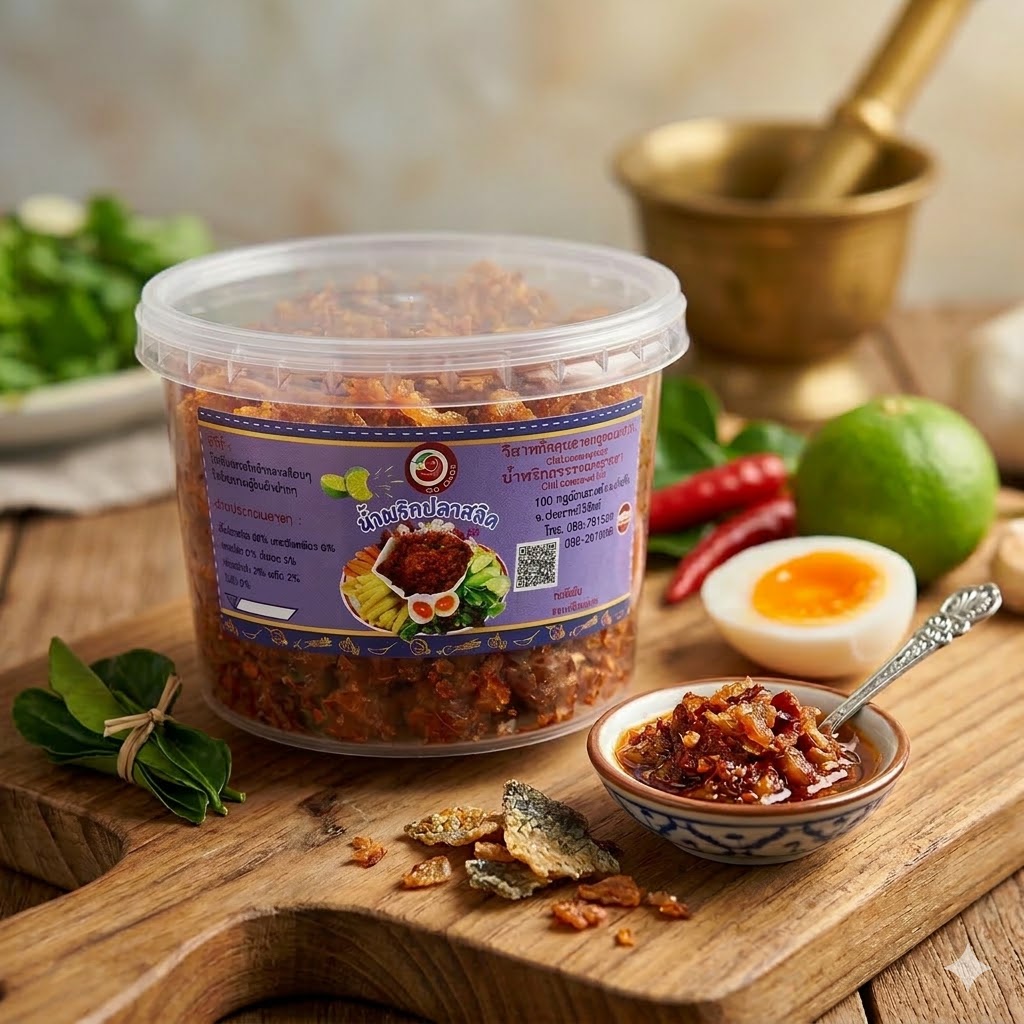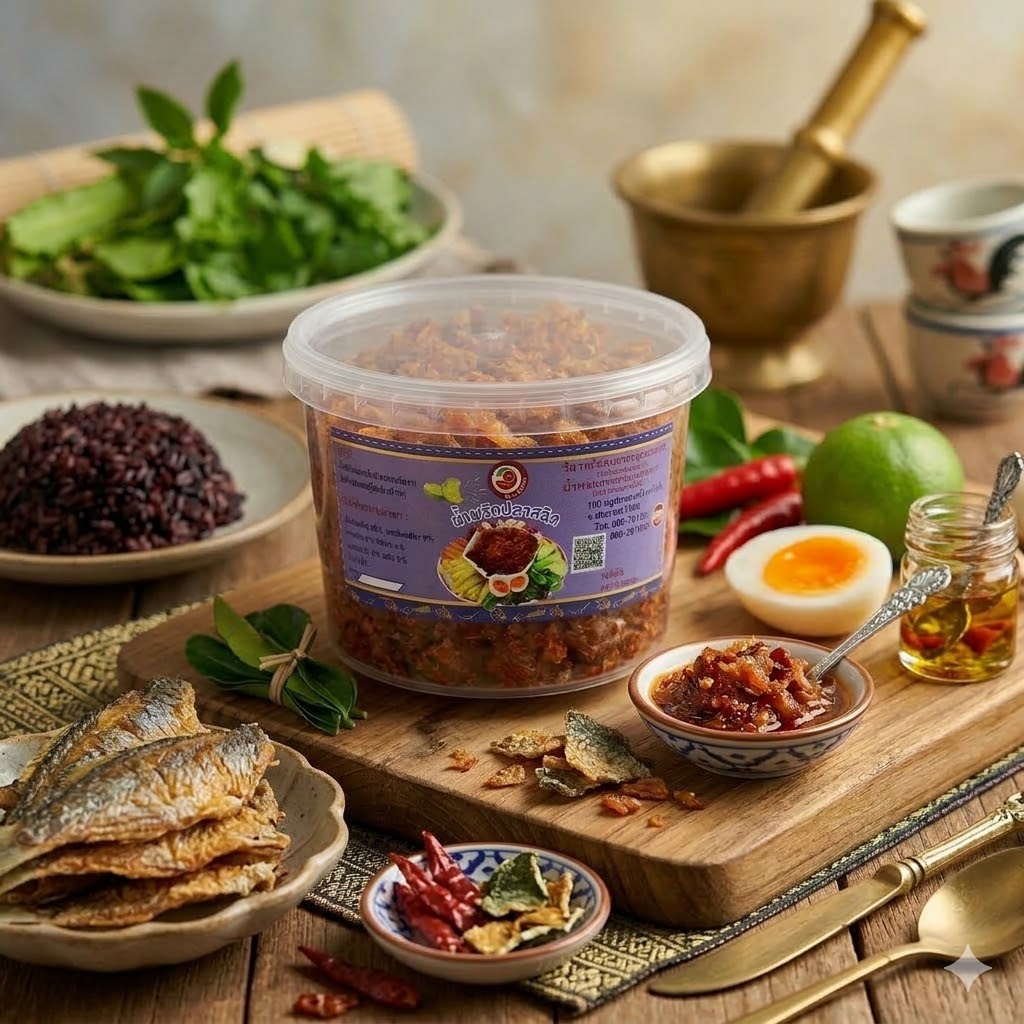 🐟 ส่วนประกอบหลัก: เนื้อปลาสลิดทอดกรอบ, พริกแห้งคั่ว, กระเทียมเจียว, หอมแดง, เครื่องปรุงรส